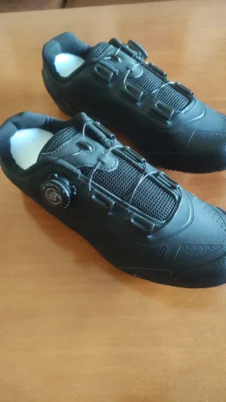 Zapatos de ciclismo negros con sistema de cierre Boa. - Cierre de dial giratorio. - Malla transpirable en la parte superior. - Suela rígida para máxima transferencia de potencia. Precio negociable