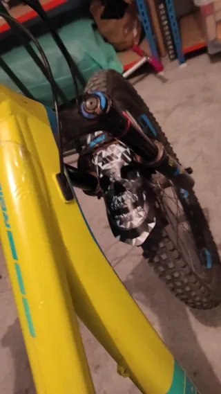 Bicicleta de montaña con un llamativo diseño en amarillo y azul. - Cuadro de aluminio. - Suspensión delantera RockShox 160mm - Ruedas Schwalbe. - Frenos de disco - ruedas líquido tubeless Es muy buena bicicleta para hacer descenso o enduro, está lista para usar todo perfecto. Tiene muy buenas suspensiones y amortigua de manera super cómoda a cualquier salto o bajada técnica o rocosa. Está súper bien para hacer rutas porque es una bicicleta ligera. La vendo porque me pasé a bicicleta de descenso ya que dejé de hacer rutas y de hacer enduro.