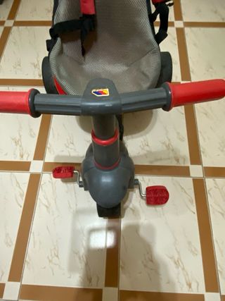 Triciclo infantil con asiento y pedales. - Estructura de plástico y metal. - Asiento con arnés de seguridad. - Empuñaduras rojas. - Ruedas negras.