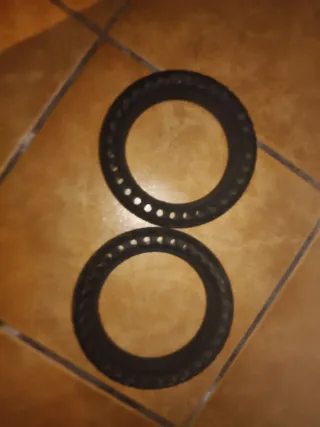 Dos ruedas macizas de repuesto para patinete. Están en buen estado. - Material: Goma. - Color: Negro. 8'5 pulgadas Parece q están desgastadas pero no! Esq no avía mucha luz