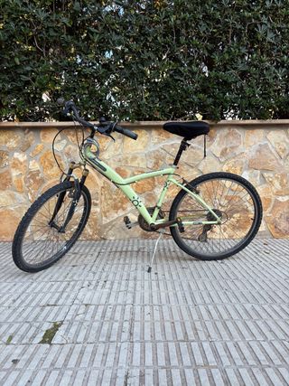 Bicicleta de montaña nueva, ideal para terrenos difíciles. Tiene un diseño llamativo y está lista para rodar. - Llantas de 26 pulgadas con neumáticos gruesos. - 21 velocidades - Doble suspensión para mayor comodidad. - Cuadro resistente y ligero. - Frenos de disco. - Accesorios Shimano