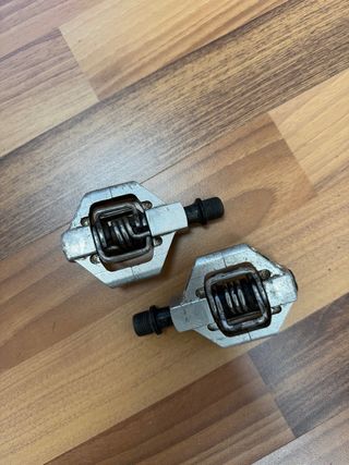 Pedales de bicicleta Crankbrothers. - Cuerpo de metal plateado. - Sistema de muelle. - Incluye calas. NO NEGOCIABLE