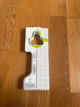 Herramienta para posicionar las calas de tus zapatillas de ciclismo. - Permite ajustar la posición de las calas con precisión. - Incluye guías y mediciones para una colocación simétrica. - Diseño plegable para facilitar su almacenamiento y transporte.
