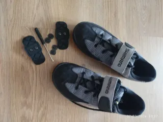 Zapatillas de ciclismo Shimano con calas incluidas. Perfectas para tus rutas. - Cierre con velcro y cordones. - Diseño en negro y gris. - Incluye calas y destornillador.
