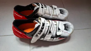 Zapatillas de ciclismo de la marca Luck, diseñadas para ofrecer un buen rendimiento. - Cierre con velcros. - Parte superior blanca con detalles en rojo y negro. - Suela con cala incorporada.