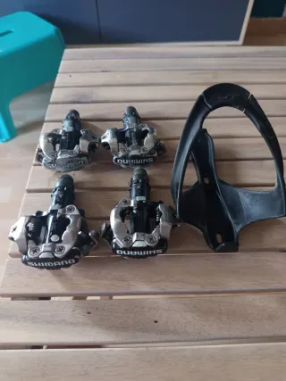 Conjunto de calas Shimano para pedales de bicicleta. - Incluye dos pares de calas. - Marca: Shimano. Y porta bidón