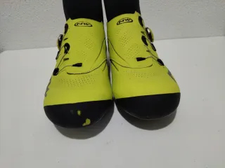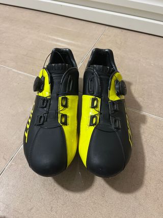 Zapatillas de ciclismo de carretera Spiuk en color amarillo brillante. Cuentan con un sistema de cierre BOA para un ajuste preciso y cómodo. Las vendo porque me compré un número inferior al mio y me están estrechas, tienen dos salidas. Se venden sin las calas. - Cierre BOA. - Diseño perforado para ventilación. - Suela rígida para máxima transferencia de potencia.