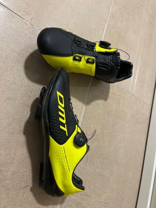 Zapatillas de ciclismo DMT R3 para carretera con suela de carbono. - Cierre BOA. - Diseño en negro y amarillo. - Suela de carbono - TALLA 41 En muy buen estado. se regalan calas tipo look keo 2 Max a estrenar.