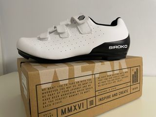 Zapatillas de ciclismo de carretera Siroko en color blanco. *Usado una sola vez Talla 41 - Cierre de velcro. - Diseño perforado para ventilación. - Detalle en negro en el talón con logo. - Suela negra. -Compatibles con calas de 3 tornillos (Shimano SPD-SL / Look)
