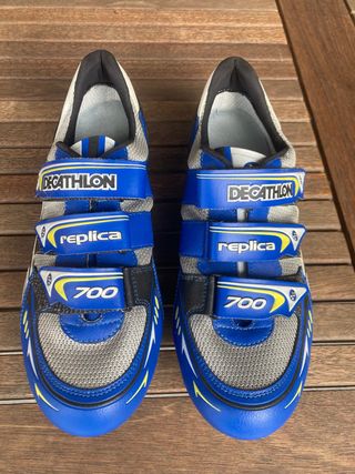 Zapatillas de ciclismo de carretera modelo Decathlon 700 Racing Replica. Para calas Look o Spd. Núm 43. Nuevas a estrenar, solo se montaron unas calas sin apretar. - Cierre de velcro. - Diseño deportivo en azul, negro y plateado.