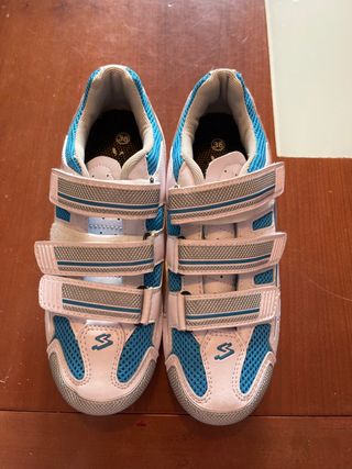 Zapatillas de ciclismo para carretera, talla 38. - Cierre con velcros. - Diseño en blanco y azul. - Suela con sistema de calas.