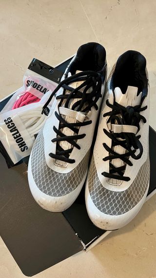 Zapatillas de ciclismo de carretera Spiuk en color blanco y negro. Cierre de velcro. Sin usar. - N° 43 - Diseño deportivo. - Suela para calas.