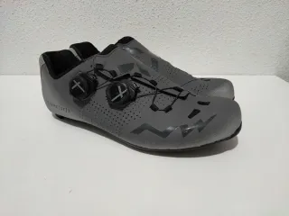 Zapatillas de ciclismo Northwave Carretera en talla 42. Incluyen calas. - Cierre Boa. - Diseño en negro con detalles plateados. - Parte superior de neopreno. - Suela con tacos. s-works, specialized,berria, castelli, giant, orbea, focus, aksium, cosmic, carbono, ciclismo, maillot, culotte, ultegra, dura-ace, 105, shimano, campagnolo, record, di2, rotor, power, kcnc, zipp, bora ultra, pinarello, ritte, cervelo, sidi, tarmac, fsa, corima, zonda, berria, asic, btwin, tubular, look, rapha merida trek giant mondraker