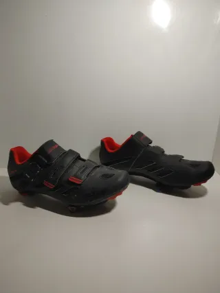 Zapatillas Shimano para ciclismo de montaña y carretera en talla 43. Incluyen calas.Practicamente nuevas. - Color negro con detalles grises y rojos. - Cierre con cordones. - Tira trasera para facilitar el calce.