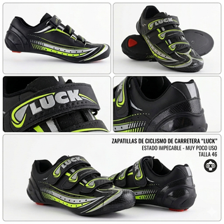 Zapatillas de ciclismo LUCK de carretera en perfecto estado. Ideales para tus rutas. Talla 41 ojo, son de ancho especial. Calas look keo grip. Peso 800gr. - Diseño elegante y deportivo. - Material de alta calidad. - Sistema de cierre BOA. - Suela de carbono. Tienen dos salidas definitivamente grandes ni con plantillas. Su precio nuevas es de 120€