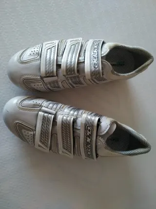 Zapatillas unisex de la marca italiana Gaerne de ciclismo para spinning en color blanco con calas. - En muy buen estado. - Cierre con tres velcros. - Diseño deportivo. - Suela rígida.