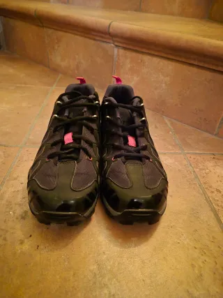 Zapatillas deportivas negras, ideales para ciclismo o spinning. Marca BTwin Núm 40 pero talla pequeño (yo suelo gastar 39) - Cierre con cordones. - Detalle de ojales en rojo. - Malla transpirable en la puntera. - Suela de goma. - calas en la suela Poco uso, como nuevas.