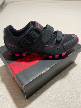 Zapatillas de ciclismo Spiuk ROCCA en color negro con detalles en rosa. - Cierre con velcro. - Suela con tacos para mejor agarre. - Diseño deportivo. -calas incluidas