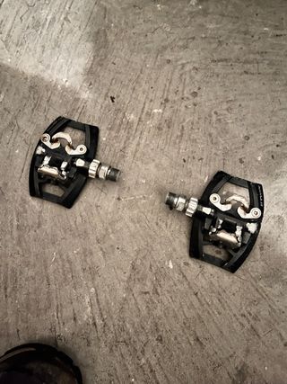 Pedales Shimano SPD con sistema de calas y plataforma. - Marca: Shimano - Modelo: SPD - Tipo: Automático con plataforma