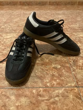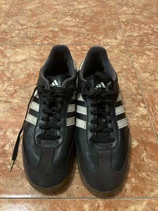Zapatillas Adidas Velosamba en talla 44 2/3. US 10.5. Diseño clásico y versátil ideal para uso en la ciudad. - Color negro con detalles blancos. - Suela de goma. - Cierre con cordones. - Incluye cala