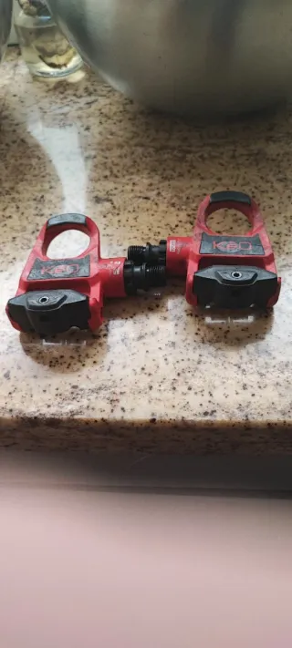 Par de pedales de carretera con diseño en negro y detalles en rojo. - Cuerpo principal en color negro. - Componentes de sujeción en color rojo. - En perfecto estado - Muy poco uso - Incluyen calas de la misma marca -140gr los pedales -160gr las calas -Modelo look keo classic 3 No negociable MTB xc rally