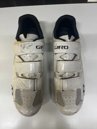 Zapatillas de ciclismo Giro para triatlón. Diseñadas para un ajuste cómodo y seguro. Talla 45. - Cierre de velcro. - Parte superior de malla transpirable. - Suela con tacos para agarre. Funcionan perfectamente. Uso aprox 2 años, con marcas de uso que no afectan al producto. Error en la talla, por eso las usé sin la suela interior que apenas tiene uso. La quité hasta que me compré unas de mi talla y dejé de usar. Se entregan sin calas. Llevaba look que se podía hablar la posibilidad de incluir. No regateos absurdos, x favor.