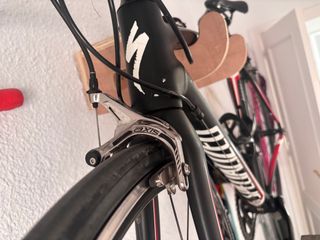Bicicleta de carretera Specialized en color negro con detalles blancos y rojos. Con doble plato delantero Ideal para ciclistas de estatura entre 1,60-1,78. -Regalo pedales para calas - Cuadro de carbono. - Frenos Axis. - Ruedas de carretera. -porta bidones - pedales convencionales (plástico)