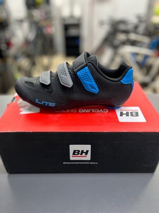 Zapatillas de ciclismo BH LITE ROAD Talla 39 y 41 en color negro con detalles en azul y gris. Perfectas para carretera. - Cierre de velcro. - Diseño perforado para ventilación. - Suela para calas de carretera.