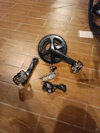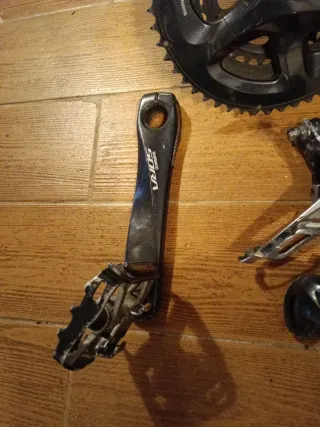 Componentes de bicicleta Shimano Sora. - Bielas con platos.3 platos - Desviador delantero.3 platos - Cambio trasero.de 9 velocidades - Pedales.mixtos calas y pedal normal