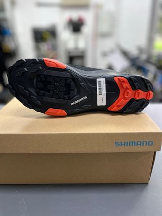 Zapatillas de ciclismo Shimano MT701 en color negro. - Cierre BOA. - Suela de goma. - Detalle naranja. - Se le pueden colocar calas