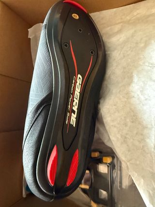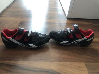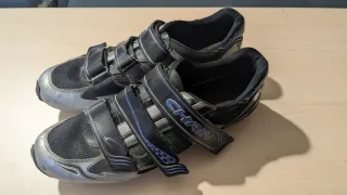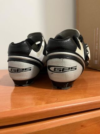 Zapatillas ciclismo de carretera GES talla 43 + calas Yo utilizo una talla 42 pero cogí un número más para no tener que llevar el pie tan comprimido y no he tenido problemas ya que ajustan bastante bien. Las calas están un poco desgastadas de pisar el asfalto pero se pueden usar perfectamente.