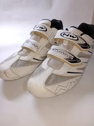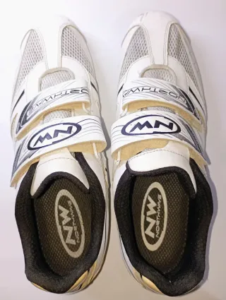 Zapatillas Northwave Jet Pro talla 46, bien cuidadas. Ideales para iniciación, entrenamiento indoor o como segunda opción económica para tener unas zapatillas de repuesto. Diseñadas para uso ocasional en carretera, con buena ventilación gracias a su parte superior de poliuretano con inserciones de malla. Características Suela NRG Air de nailon reforzada con fibra de vidrio Plantilla Air Sport ventilada Sistema AirFlow para mejor ventilación Sistema integrado de sujeción del talón Cierre con 2 correas de velcro asimétricas Compatible con pedales de carretera (3 tornillos) y SPD Calas no incluidas Peso aprox. 263 g Color: blanco.