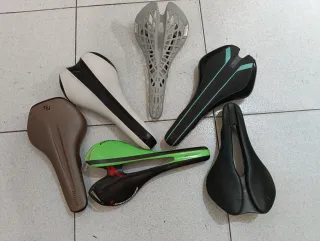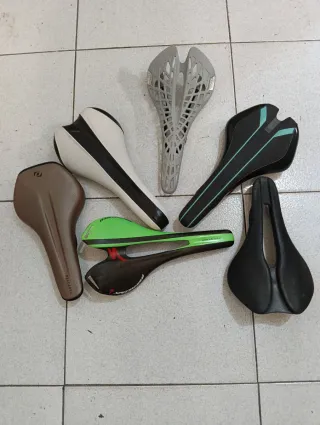 Conjunto de sillines de bicicleta de diferentes marcas y diseños.Desde 10 euros - Sillín marrón Syncros belcarra - Sillín blanco y negro, selle - Sillín gris calado, tipo tioga - Sillín negro con detalles turquesa. - Sillín verde y negro, carbono Specialized - Sillín negro con canal central Selle Italia.