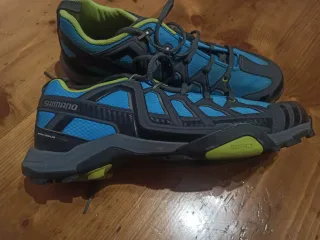 Zapatillas de ciclismo de montaña Shimano en talla 47. Diseñadas para ofrecer comodidad y rendimiento en tus rutas. son un par de números más grandes para poder llevar calcetines gordos en invierno. Incluye calas spd, me las regalaron pero casi no las he usado - Color azul y verde lima. - Cierre con cordones. - Suela con buen agarre.