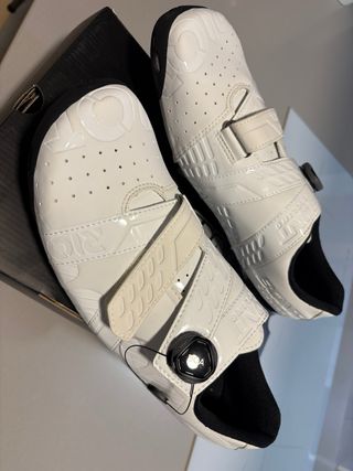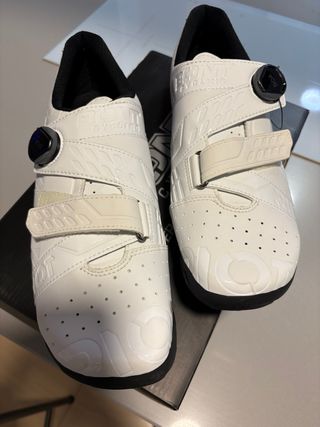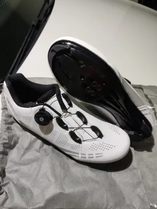 Zapatillas de ciclismo de color blanco con cierre de dial. - Suela negra con anclajes para calas. - Diseño perforado para ventilación. - Cierre de dial y cordones. - Incluye bolsa de tela. Núm 41 corto mejor si usas 40 son de piel sintética, no de plástico como anuncia otras webs. Para hombre o mujer . Oportunidad.