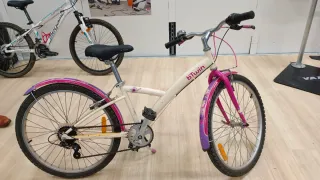 Bicicleta infantil Btwin Mistigirl 300 en color blanco. Ideal para iniciarse en el ciclismo. - Ruedas de 20 pulgadas. - Frenos V-brake. - Sillín y puños en color rosa. - Incluye timbre y reflectantes. Usada sólo dos veces,está nueva.