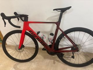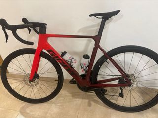 Bicicleta de carretera Giant con un diseño aerodinámico y acabado degradado de rojo a granate. - Toda entera de carbono - Frenos de disco. - Manillar integrado. - Portabidones incluidos.