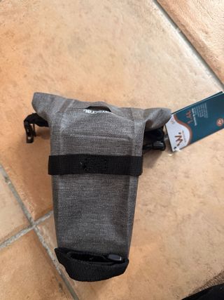 Bolsa de sillín para bicicleta con capacidad de 1.4 litros. Es de color gris y tiene un diseño enrollable. - Cierre enrollable. - Correa de sujeción. - Material resistente.