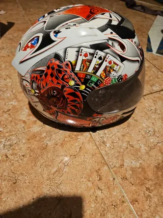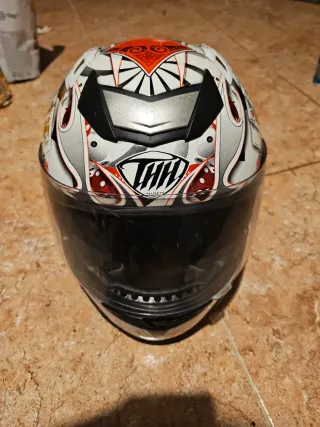Casco de moto THH en talla L. Diseño llamativo con detalles en rojo y blanco. - Talla L - Marca THH - Visera oscura - Diseño gráfico