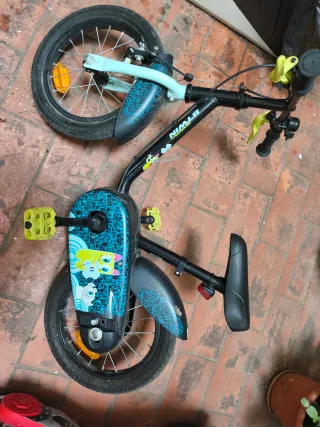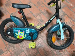Bicicleta infantil Btwin con un divertido diseño de monstruo. Esta en perfecto estado ya que tiene muy poco uso se le quedo pequeña. Los pedales también los tengo para que se puedan volver a colocar. - Ruedas de 12 pulgadas. - Color principal negro con detalles en azul y amarillo. - Guardabarros delantero y trasero. - Sillín ajustable en altura. - luz en parte trasera