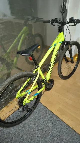 Bicicleta de montaña Rockrider ST 100 en llamativo color neón. Para adulto o para niña de mas 1'40