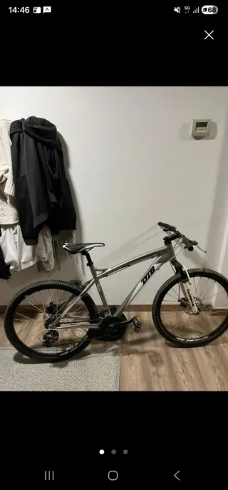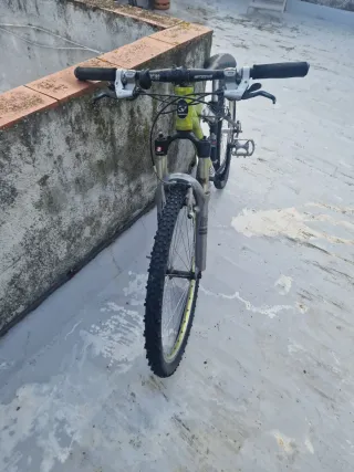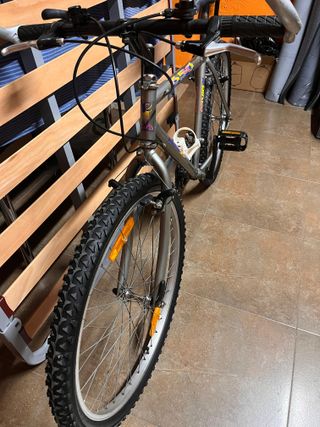 Bicicleta de montaña plateada y negra. - Cuadro de aluminio. - Suspensión delantera. - Frenos de disco. Impoluta sin ningún tipo de rasguño Neumáticos nuevos comprados ayer en dechatlon solo usar y disfrutar ideal para regalo de reyes o ocio está prácticamente nueva Ruedas 26 De 1.60 hasta 1,79cm