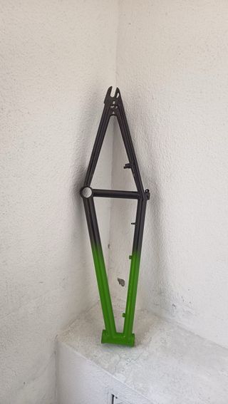 Cuadro de BMX con un diseño único y acabado pintado que simula el efecto carbono. La parte inferior presenta un degradado vibrante en color verde. - Pintura con efecto carbono. - Degradado de color verde en la parte inferior.