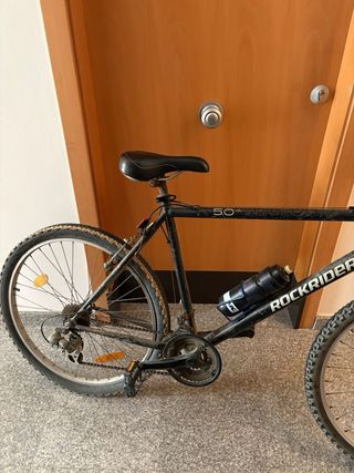 Bicicleta de montaña Rockrider. - Cuadro de color negro. - Ruedas de 26 pulgadas. - Incluye portabidón.