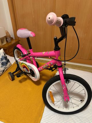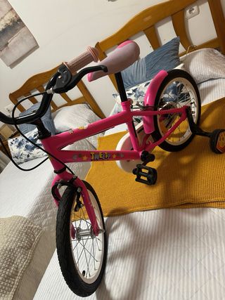 Bicicleta infantil de color rosa, ideal para los más pequeños. - Ruedines de aprendizaje incluidos. - Diseño divertido con dibujos. - Puños de goma para un mejor agarre.
