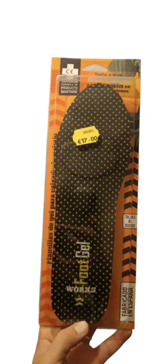 Plantillas de gel FootGel Works para calzado. - Talla 43-47. - Fabricado en España. - Certificación Europea de Producto Sanitario. - Diseño con puntos de gel.