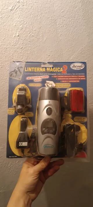 Linterna frontal y trasera para bicicleta, modelo Linterna Mágica 2 de Dicoal. Incluye cargador. - Linterna frontal y trasera. - Cargador de 12V. - No necesita baterías, es recargable.
