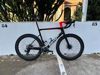 BMC Teammachine SLR01 ONE - Este modelo de 58 cm está equipado con componentes SRAM Red AXS 2x12 de alta calidad con potenciómetro Quarq. Recomendada para alturas de 180 a 192 cm. La bicicleta cuenta con manillar y potencia de carbono integrados, ruedas de carbono CSC de 58 mm con tubos de TPU y sillín Selle Italia con raíles de carbono. La vendo porque me queda pequeña. ¡Lista para usar! Peso 7,5 kg con portabidones, pedales y soporte Garmin. Transmisión: 48-35 dientes (delantera) y 10-33 dientes (trasera)