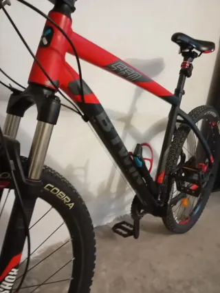 Bicicleta de montaña BTWIN 520 en color rojo y negro. Ideal para senderos y caminos. - Cuadro de aluminio. - Suspensión delantera. - Frenos de disco. - Ruedas de 29 pulgadas.