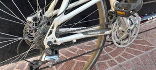 Bicicleta de montaña Trek Top Fuel 9.8 del año 2016. Cuadro de carbono talla L, pintada recientemente a capricho, blanco perlado y plata, horquilla Fox Step Cast y amortiguador Fox Float con bloqueo al manillar, ruedas de carbono Bontrager Kovee PRO, frenos XT, cambio Sram Eagle XXI, casette XXI dorado, bielas de carbono, tija KCNC ultralight, pedales XTR casi nuevos. Una bici ideal para XC Maratón